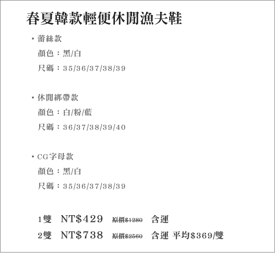 商品訊息簡述: 平均每雙最低只要369元起(含運)即可購得春夏韓款輕便休閒漁夫鞋1雙/2雙,款式:蕾絲款/休閒綁帶款/CG字母款,顏色、尺碼任選。