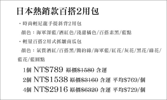 商品訊息簡述: 平均每個最低只要729元起(含運)即可購得日本熱銷款百搭2用包1個/2個/4個,款式:時彿揖尾s手提斜背2用包/輕量百搭2用式抓皺南瓜包,均有多色可選。