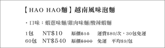 商品訊息簡述: 平均每包最低只要9元起即可購得【HAO HAO麵】越南風味泡麵1包/60包,口味:蝦蔥味麵/雞肉味麵/酸辣蝦麵,購滿30包即享免運優惠!