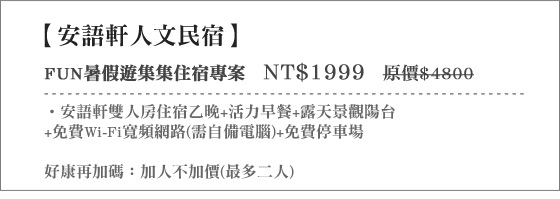 商品訊息簡述: 只要1999元(雙人價)即可享【安語軒人文民宿】原價4800元FUN暑假遊集集住宿專案:安語軒雙人房住宿乙晚+活力早餐+露天景觀陽台+免費Wi-Fi寬頻網路(需自備電腦)+免費停車場。好康再加碼:加人不加價(最多二人)!