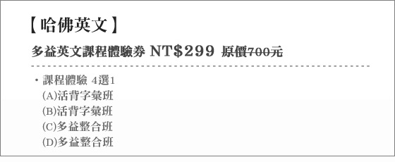 商品訊息簡述: 只要299元即可享有【哈佛英文】原價700元多益英文課程體驗券:(A)活背字彙班/(B)活背字彙班/(C)多益整合班/(D)多益整合班(4選1)