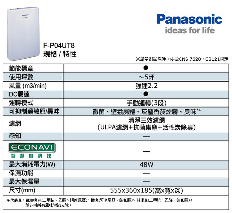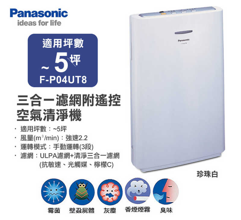 【國際牌Panasonic】空氣清淨機(F-P04UT8),採用集塵力超強的ULPA+抗菌濾網,能嚴格過濾空氣中對健康有害的懸浮微粒,減少過敏原,特製清淨三合一濾網,結合抗敏速、光觸媒、檸檬C的空氣清淨功能,制菌加除臭,讓全家都能享受清新潔淨的健康居家生活!
