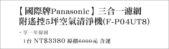 商品訊息簡述: 只要3380元(含運)即可購得【國際牌Panasonic】原價6000元三合一濾網附遙控5坪空氣清淨機(F-P04UT8)1台,享一年保固。