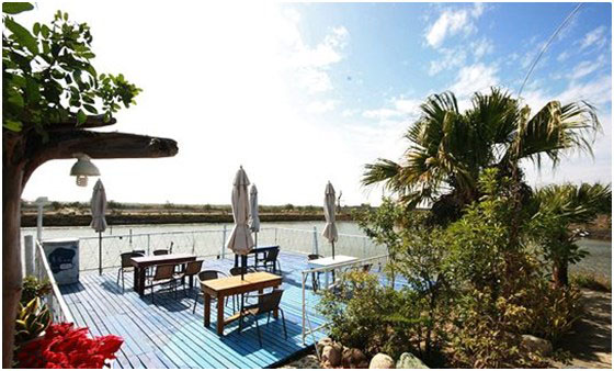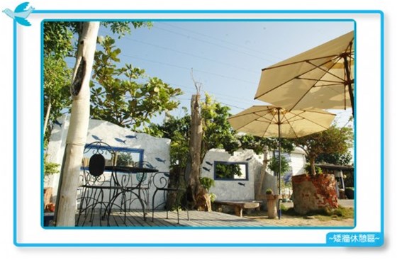 台南七股【欖人生態民宿】幾間藍白相間的南洋風度假小屋,在和煦陽光照射下,彷彿置身國外度假村。屋外搭建在魚塭上的觀景平台上有人悠閒喝著咖啡,魚塭上則有幾位年輕人悠哉劃著竹筏,享受竹筏樂,另一旁小朋友忙著餵魚玩耍。