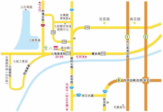(1)國道1號→下麻豆交流道→接176縣道→佳里(往七股方向)→七股→省道17號(左轉往台南方向)→國姓橋下右轉→173縣道(20.6公里處)→建功國小→欖人生態民宿