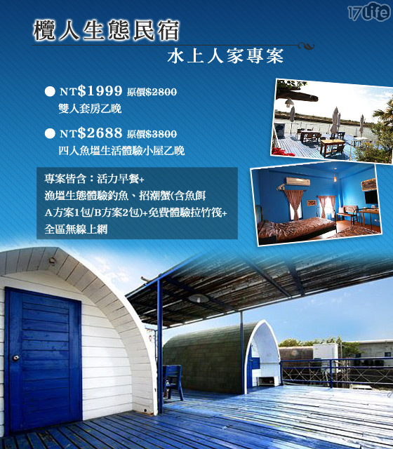 商品訊息簡述: 只要1999元起即可享【欖人生態民宿】原價最高3800元水上人家專案:(A)雙人套房乙晚/(B)奶H魚塭生活體驗小屋乙晚,以上專案皆含活力早餐+漁塭生態體驗釣魚、招潮蟹(含魚餌:A方案1包/B方案2包)+免費體驗拉竹筏+全區無線上網!