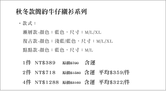 商品訊息簡述: 平均每件最低只要322元起(含運)即可購得秋冬款簡約牛仔襯衫系列1件/2件/4件,款式:漸層款/復古款/點點款,皆有多色多尺寸任選!