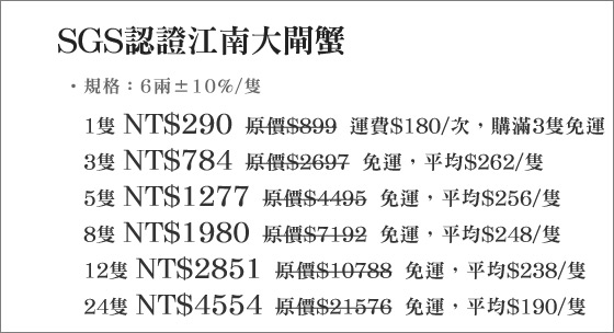 商品訊息簡述: 平均每隻最低只要190元起(3隻免運)即可購得SGS認證江南大閘蟹1隻/3隻/5隻/8隻/12隻/24隻(6兩±10?)。